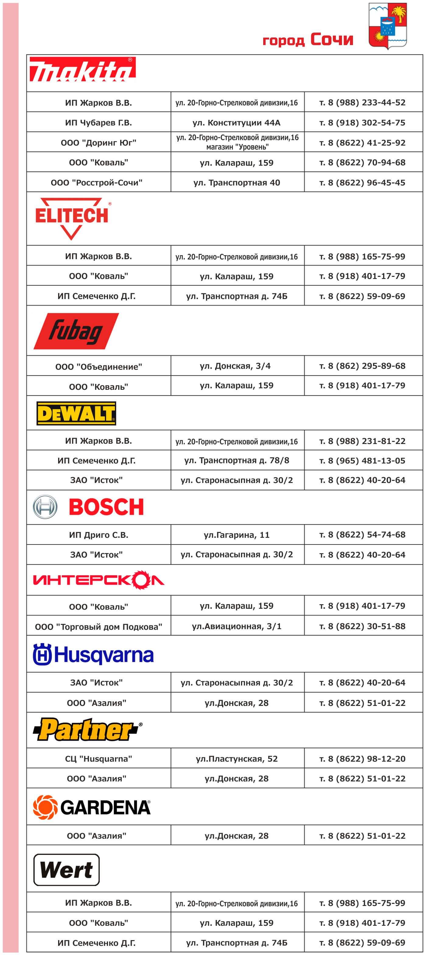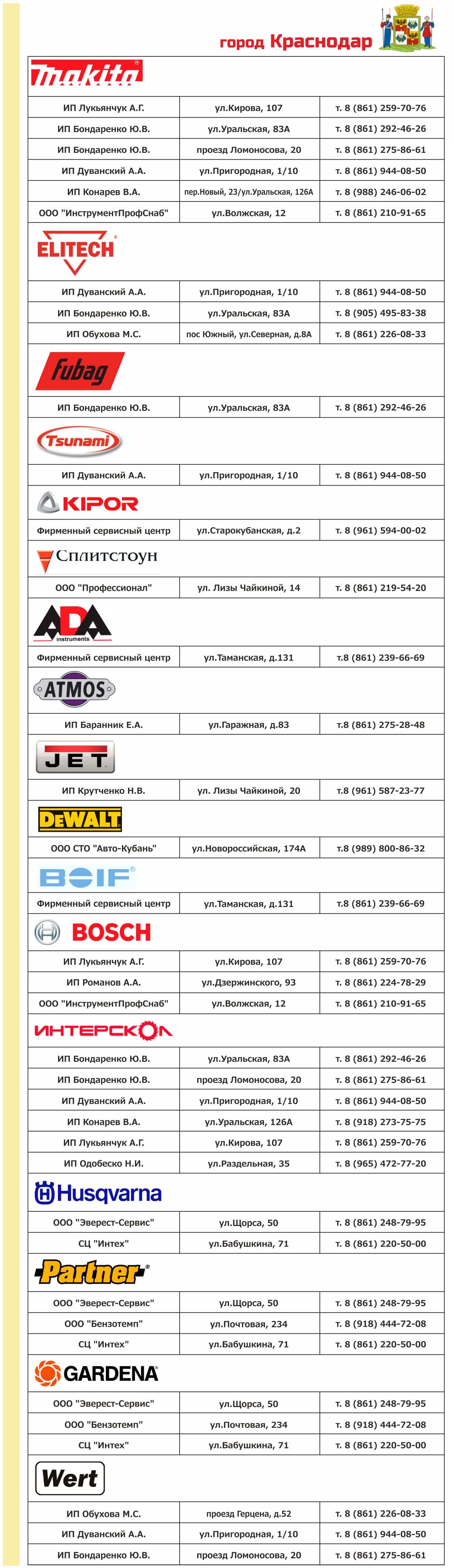 Для Вашего удобства, на данной странице мы разместили актуальный список официальных сервисных центров в Краснодаре, Ростове, Сочи. В данной таблице вы найдете адреса и номера телефонов авторизованных центров следующих производителей: Makita, Husqvarna, Интерскол, Bosch, Fubag, Elitech, Wert, Gardena, Partner, DeWalt, JET, Atmos, ADA, Kipor, Tsunami, Сплитстоун, Boif.