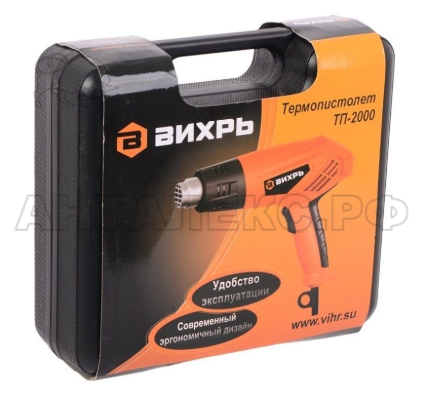 В интернет-магазине Анталекс.рф вы можете купить термопистолет Вихрь ТП-2000 72/2/1 оптом, в розницу по самым низким ценам с доставкой в любой регион РФ. Изделие предназначено для нагревания различного рода материалов при строительных, автослесарных и других работах. Например, с его помощью можно удалить лак или краску, продуть отверстия, а также просушить детали оборудования разного рода. Мощный 2000-ваттный двигатель обеспечит превосходную производительность тепла и удобство работы с изделием. Небольшой вес (0.75 кг) и габариты облегчают пользование инструментом. Устройство работает от сети 220В/50 Гц и имеет три режима работы: с расходом воздуха 150 л/мин и t 25 градусов C; с расходом воздуха 300 л/мин и t 350 градусов C, с расходом воздуха 500 л/мин и t 600 градусов C.