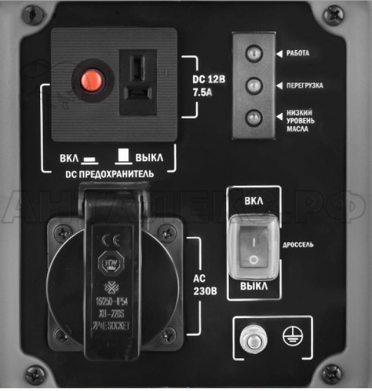 Бензогенератор Elitech БИГ 1000 прост в эксплуатации, оснащен панелью управления с одной розеткой 220В переменного тока, автоматическим выключателем генератора и индикатором нормальной работы генератора, индикатором перегрузки генератора, индикатором низкого уровня масла генератора, защитой розеток от влаги и пыли, а также розеткой с выходом постоянного тока 12В. Данная розетка пригодна для подзарядки соответствующих аккумуляторов, и питания маломощного электроинструмента.