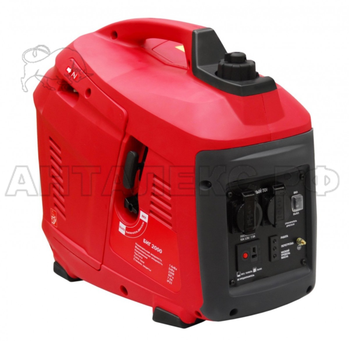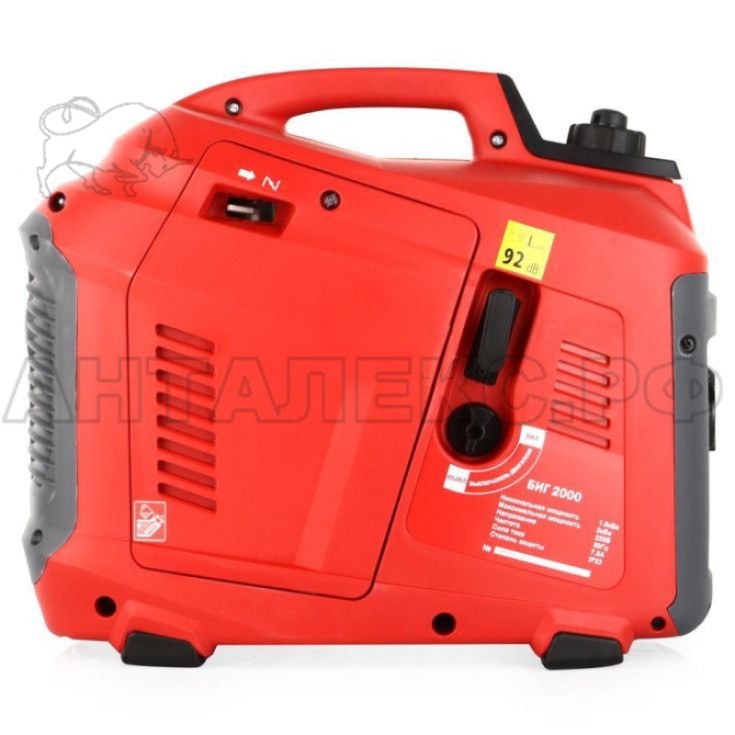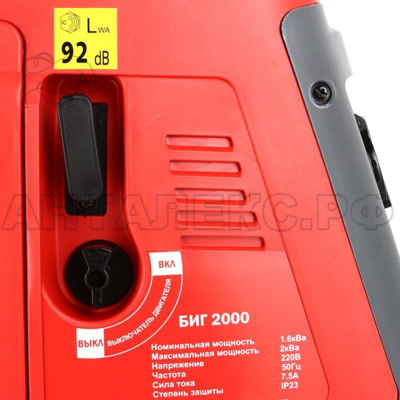 Модель Elitech БИГ 2000 оснащена системой защиты от перегрузки по току, а также системой защиты по уровню смазочного масла. Запуск первичного двигателя осуществляется ручным шнуровым стартером, и облегчен благодаря наличию пусковой катушки обеспечивающей высокую энергию воспламеняющей топливо искры.