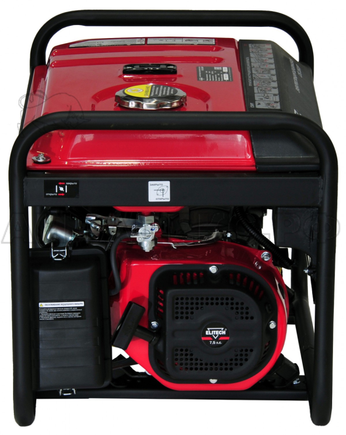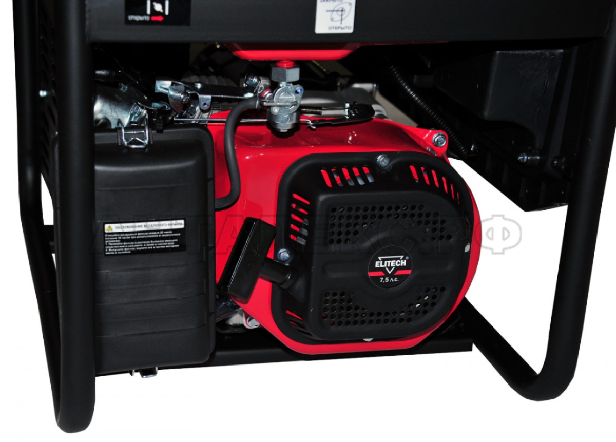 Модель Elitech СГБ 3500 Р  оснащена системой защиты от перегрузки по току, а также системой защиты по уровню смазочного масла. Запуск  первичного двигателя осуществляется посредством ручного шнурового стартера и облегчен благодаря наличию пусковой катушки обеспечивающей высокую энергию воспламеняющей топливо искры.