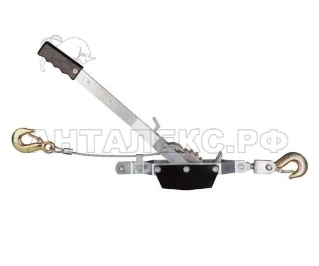 Данное устройство приводится в действие с помощью трещотки и рычага. Фиксаторы предохраняют барабан от разматывания под тяжестью груза. Изделие имеет малый вес, эргономично не требует жесткой фиксации корпуса (может работать на подвесе), удобно в управлении. К недостаткам относится малая длина троса, не больше 6 m.