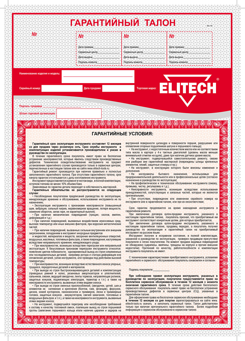 Гарантийное и сервисное обслуживание - по предоставлению чека или оформлению гарантийного талона на сайте Elitech.ru