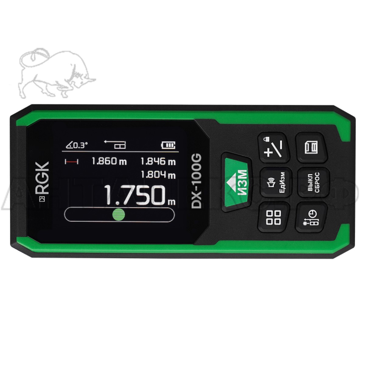 Лазерный дальномер RGK DX100G – портативный комбинированный инструмент с 1,5-миллиметровой точностью и максимальной рабочей дистанцией 100 м, дополнительно позволяющий контролировать угловое положение линии измерения в вертикальной плоскости в процессе замеров благодаря наличию встроенного инклинометра. Прибор проецирует зеленый луч, пятно от которого на окружающих предметах лучше различается человеческим глазом, что упрощает выполнение замеров при ярком свете. В отличие от изделий более дешевых серий, данное устройство оборудуется цветным графическим IPS-дисплеем с диагональю 2 дюйма, с инверсным отображением данных, благодаря чему отличается улучшенной наглядностью.