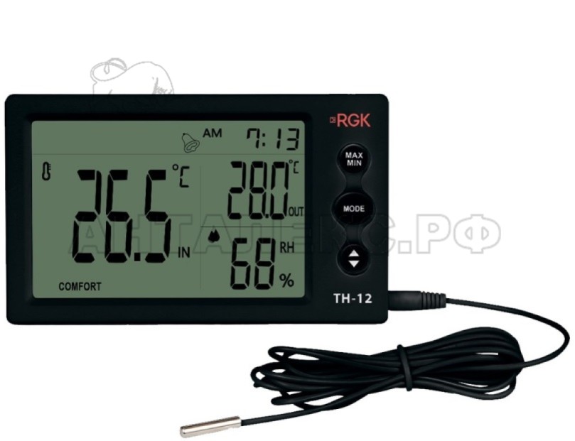 У прибора большой LCD-дисплей RGK TH-12 776462 с чётким и легко читаемым изображением, часы с возможностью выбора формата времени 12 ч /24 ч, индикатор комфорта. Термогигрометр просто и легко использовать, есть возможность измерять максимальное и минимальное значения температуры и влажности.