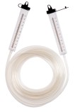 При выполнении многих строительных и ремонтных работ (укладка фундамента, кладка стен, заливка полов и так далее) необходимо отмечать точки на одном уровне расположенные на большом удалении друг от друга. В таких ситуациях на помощь специалистам приходит водяной уровень, который действует по принципу сообщающихся сосудов и точно показывает соотношение уровней у точек отсчёта. Водяной уровень состоит из 2 колб и прозрачного гибкого шланга. На колбах нанесена разметка, с помощью которой можно точно измерить разность уровней в измеряемых точках.