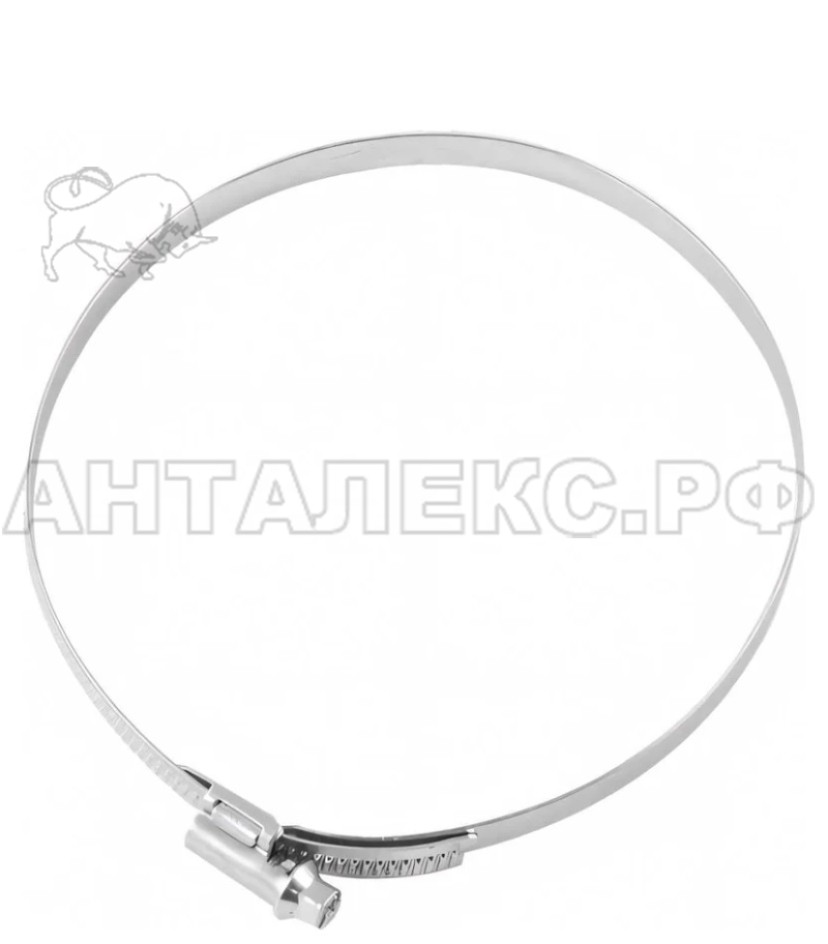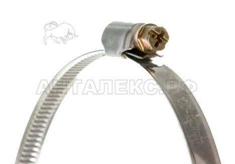 Хомут состоит из винта, стальной нержавеющей ленты с рифленой поверхностью и замкового механизма червячного типа, который обеспечивает нужный интервал и угол резьбы соединения.