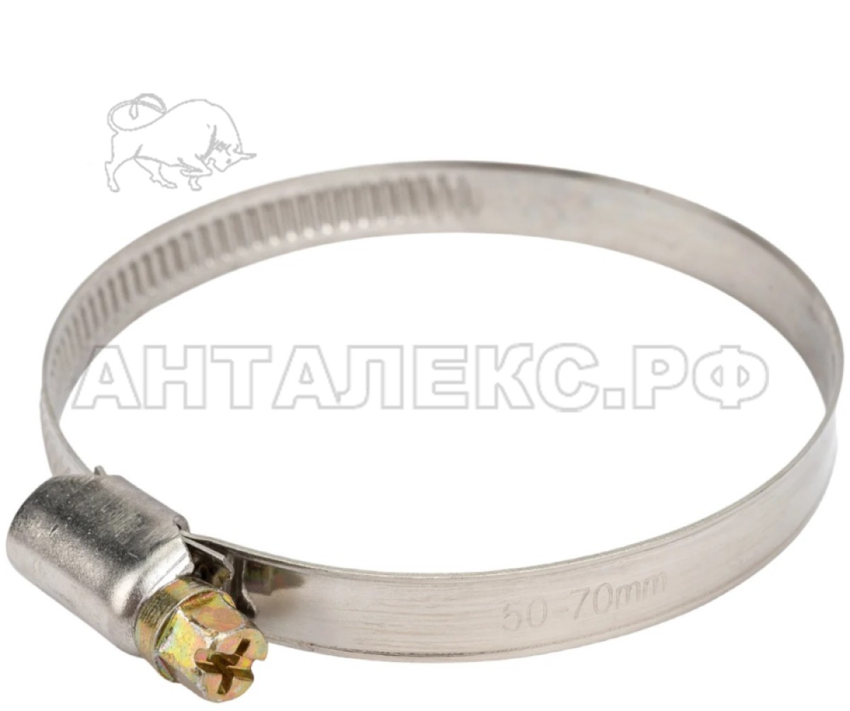 Червячный стальной хомут диаметром 50-70 мм (артикул 47-4-070) применяется для соединения труб, патрубков и шлангов.