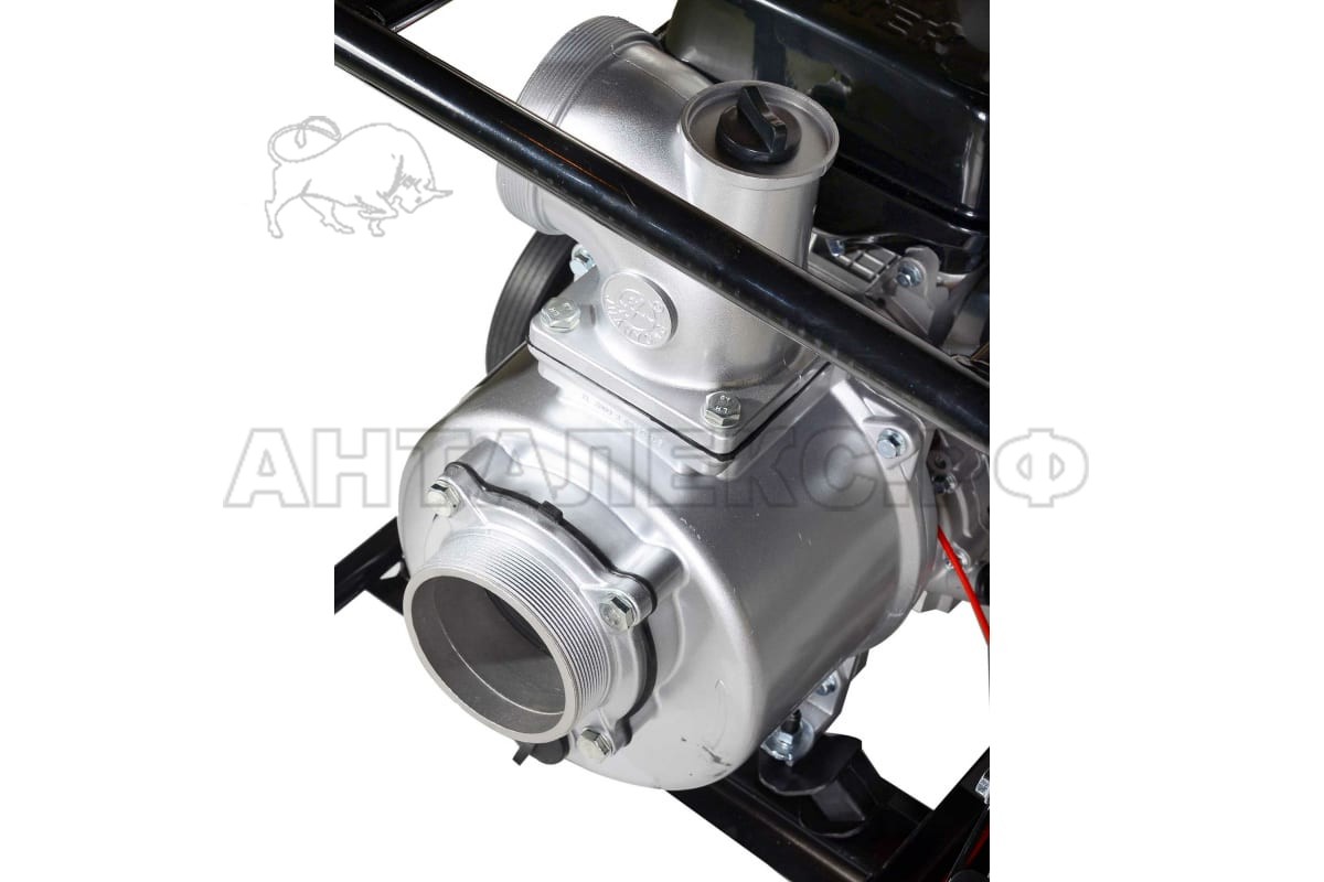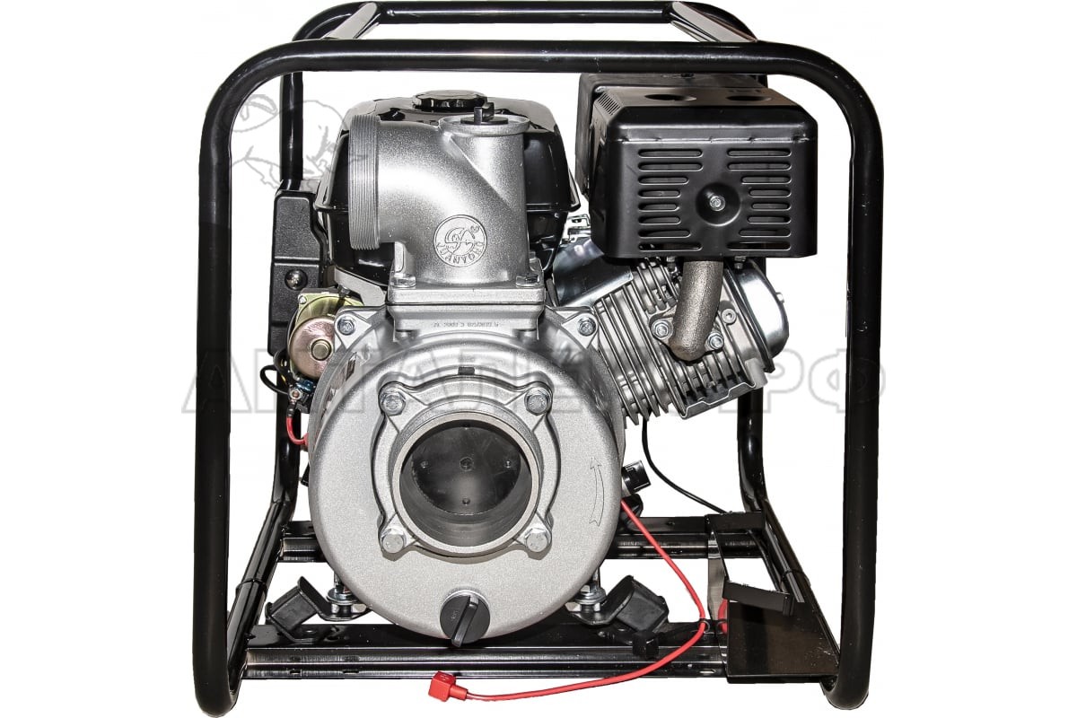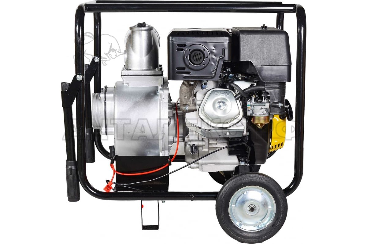 Механизм мотопомпы защищен от повреждений благодаря металлической раме, устройство устойчиво благодаря металлическому корпусу. Два колеса с покрышками позволяют быстро перемещать аппарат с минимумом усилий.