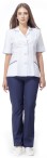 Костюм состоит из белой блузы прямого силуэта и брюк красного цвета. Блуза — с коротким рукавом, центральной бортовой застёжкой на заклёпки, до пояса. Воротник-стойка, трубообразный. Снизу по бокам блузы накладные карманы. Бёдра подчеркивает широкой пояс. Воротник, низ рукавов и пояс отделаны красным кантом. Брюки длинные прямые, по талии на резинке.