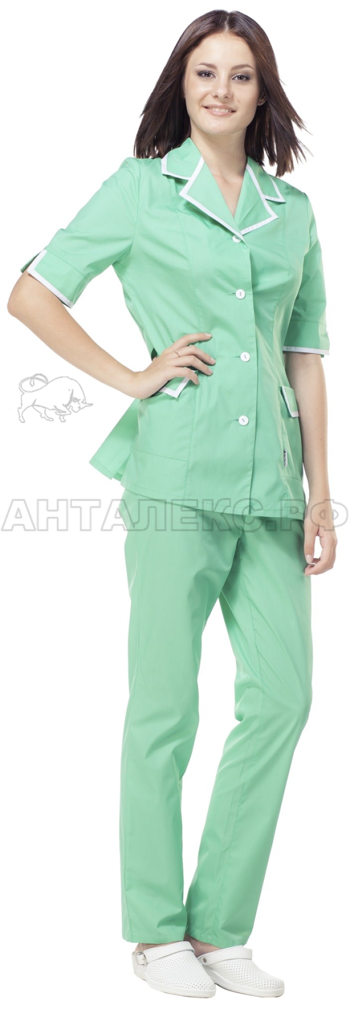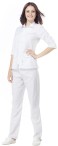 Костюм состоит из блузы прямого силуэта и брюк. Блуза с коротким рукавом и центральной бортовой застёжкой на пуговицах. V-образный вырез и отложной воротник. Карманы накладные, на пуговицах, снизу по бокам изделия. Края воротника, рукавов и карманов белого цвета. Брюки длинные прямые, по талии на резинке. Костюм отлично подходит для медицинского персонала и косметологов.