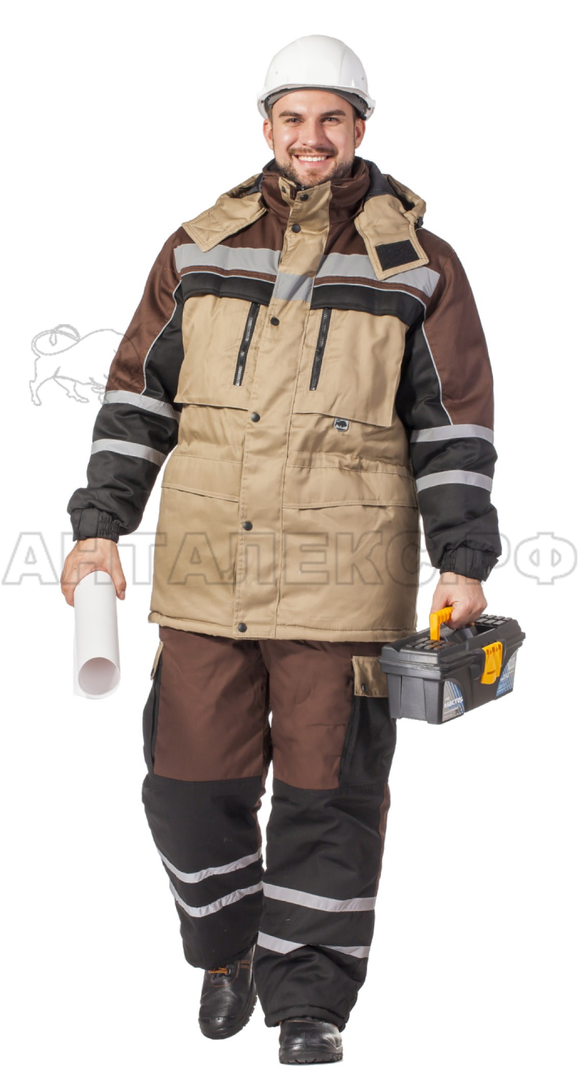 Утепленный костюм "Универсал" коричневого цвета изготовлен из высококачественного долговечного материала. Имеет множество удобных карманов с клапанами, нагрудные карманы на молнии. Костюм не боится низких температур за счет хорошего утеплителя. Застежка на куртке - молния, закрыта планкой, фиксирующейся на кнопках. Куртка имеет трикотажный манжет. Воротник "стойка", выполнен из флиса. Костюм оснащен светоотражающими полосами по низу полукомбинезона, на груди и на рукавах. Материал верха ткань смесовая влагостойкая (50% хлопок, 50% полиэфир) 215 г/м2.