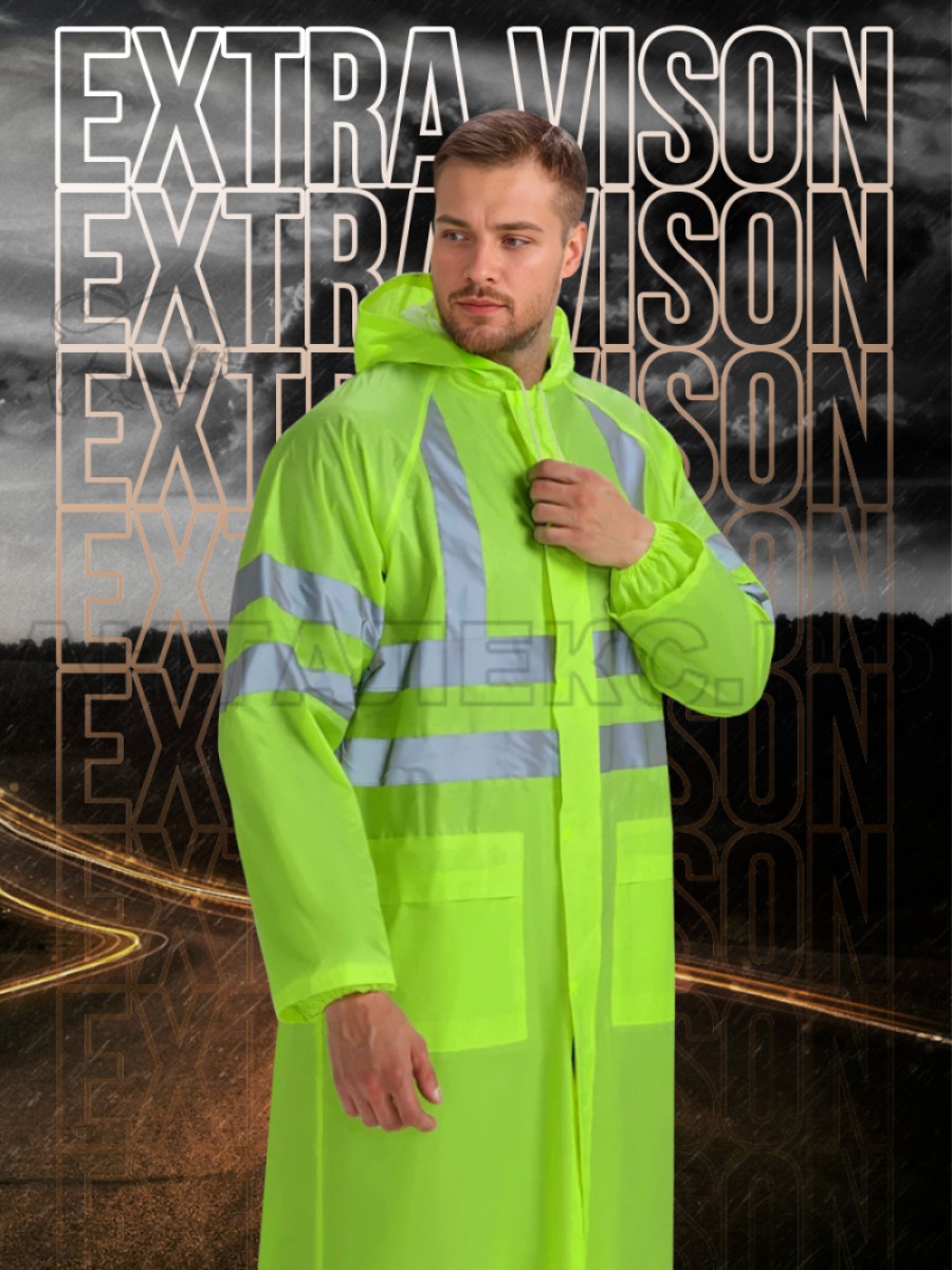 Плащ обладает хорошими свойствами вентиляции. Удобный покрой изделия, не сковывает движения и отлично сидит по фигуре. Плащ влагозащитный "Extra Vision" изготовлен из высококачественного полиэфирного полотна, что обеспечивает высокие защитные свойства от воды и ветра. Плащ влагозащитный сигнальный оснащен светоотражающими полосами, что обеспечивает безопасную работу как в условиях плохой видимости, так и в темное время суток.