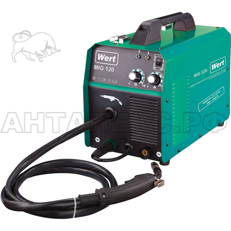 В интернет-магазине Анталекс.рф вы можете купить инверторный сварочный полуавтомат WERT MIG 120 оптом и в розницу по самым низким ценам с доставкой в любой регион РФ. Назначение аппарата - проведение сварочных работ в режиме полуавтоматической сварки проволокой диаметром до 0.8 мм (MIG/MAG/FLUX) и ручной сварки покрытым электродом диаметром до 3 мм (MMA). Прекрасно подходит для работы в местах с электроэнергией низкого качества.