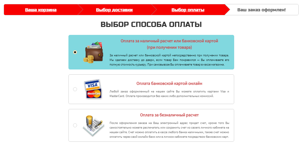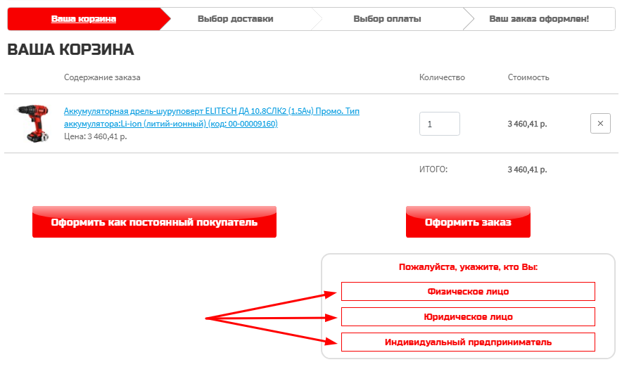 Нажав кнопку «Оформить заказ» Вы перейдете на страницу корзины, где Вам будет предложено оформить заказ как физическое лицо, юридическое лицо или индивидуальный предприниматель.