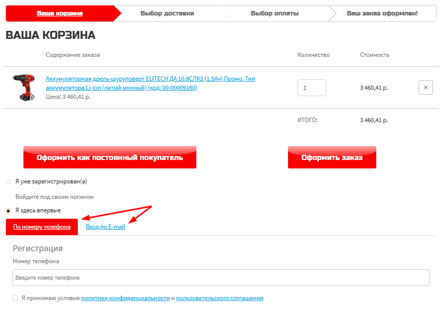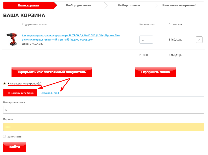 Также Вы можете оформить заказ как постоянный покупатель, для этого Вам необходимо пройти быструю регистрацию по номеру телефона или электронной почте.