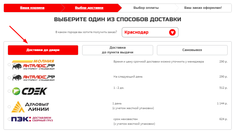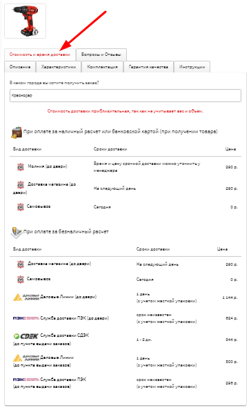 Примерную стоимость доставки товара Вы можете узнать во вкладке «Стоимость и время доставки». Стоимость доставки указана для различных типов доставки (до пункта выдачи, до двери) и разными транспортными компаниями.
