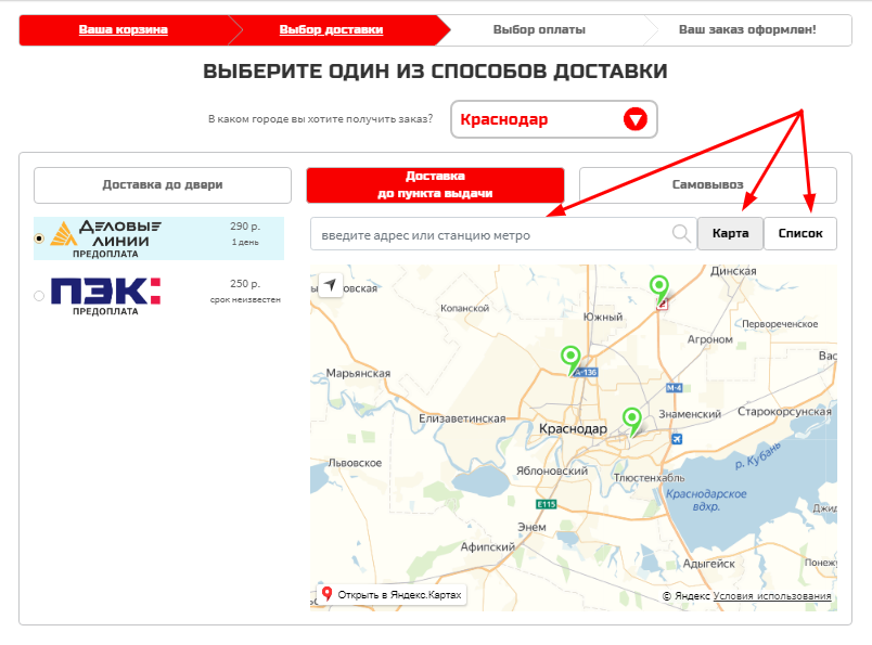 Доставка до пункта выдачи производится транспортными компаниями (CDEK, ПЭК, Деловые линии) по всей территории Российской Федерации. В данном разделе Вам необходимо выбрать транспортную компанию и после этого на карте отобразятся все пункты выдачи данной ТК, выберете ближайший к Вам пункт выдачи заказов. Если Вам не совсем удобно работать с картой, откройте вкладку список и выберите наиболее удобный пункт выдачи.