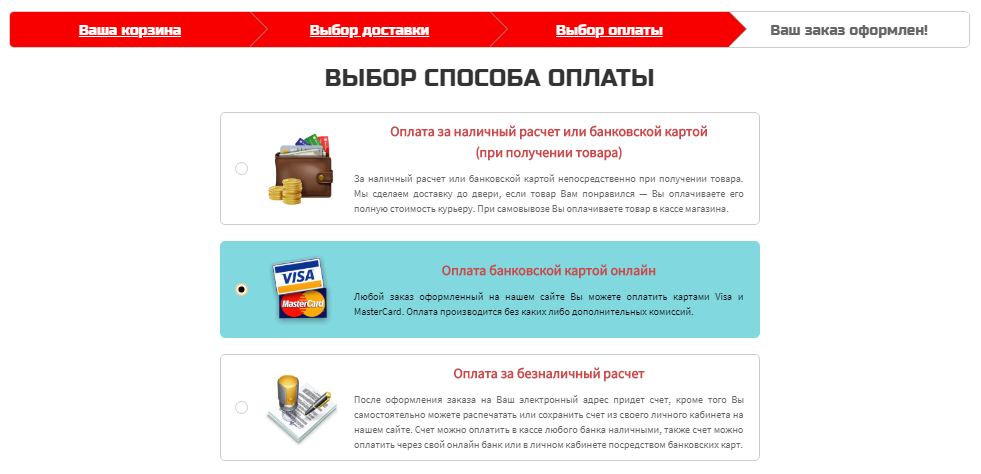 Любой заказ оформленный через интернет-магазин Анталекс, можно оплатить банковскими картами Visa или MasterCard прямо на сайте, во время оформления заказа. При оплате заказа на сайте, дополнительная комиссия не взимается!