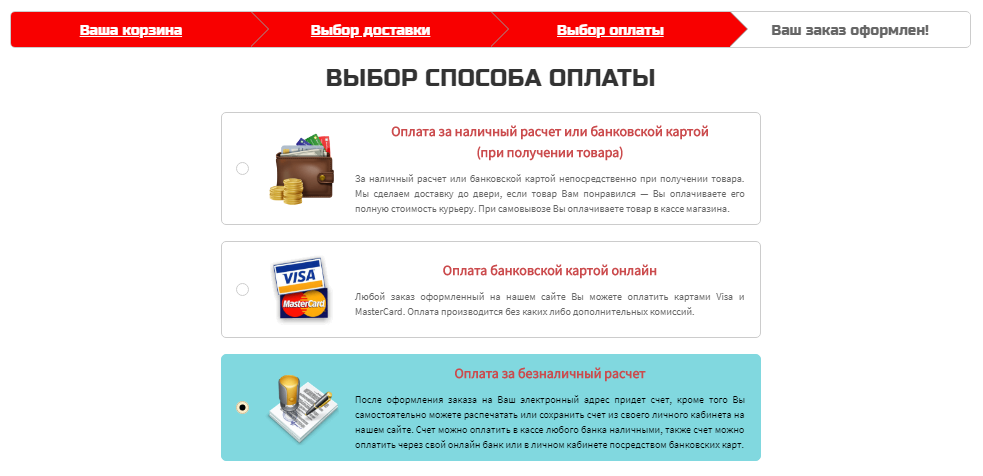 Также заказ можно оплатить по безналичному расчету. После оформления заказа на указанную электронную почту придет счет на оплату, который можно оплатить в онлайн банке в личном кабинете или наличными в кассе любого банка. Счет на оплату также будет храниться в личном кабинете интернет-магазина и вы сможете его самостоятельно сохранить или распечатать в любой момент.