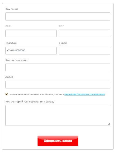 Если Вы оформляете заказ как юридическое лицо, заполните следующие данные: название компании, ИНН компании, КПП компании, номер телефона, электронную почту, ФИО контактного лица, адрес доставки, комментарий к заказу.