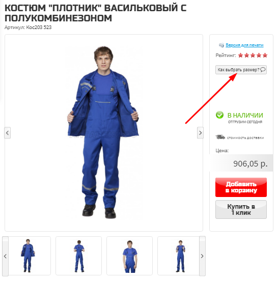 При выборе товаров из раздела «Спецодежда» в выборе размера одежды Вам поможет наша небольшая инструкция, которую можно открыть, нажав на кнопку «Как выбрать размер?»