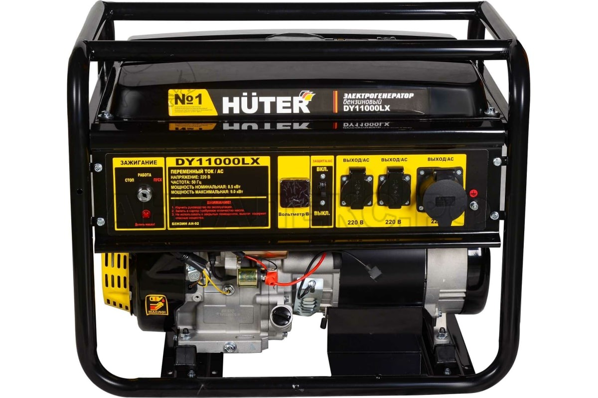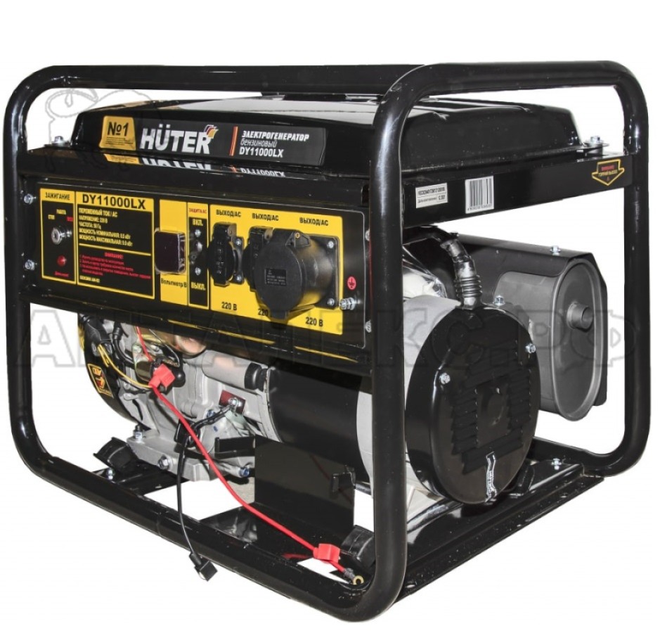 Электрогенератор Huter DY11000LX-электростартер 64/1/72 – портативная компактная электростанция для электроснабжения бытовой техники и профессионального оборудования, питающегося от стандартной однофазной сети 220 Вольт. Модель обладает оптимальными техническими характеристиками и низким расходом топлива, может использоваться в качестве резервного источника питания для частных домов и квартир, как постоянная станция, обеспечивающая работу электроприборов в полевых условиях. Генерирующая установка имеет синхронный тип устройства и щёточный механизм, мощный одноцилиндровый четырёхтактный двигатель внутреннего сгорания, мощностью 19 л.с. Рабочая мощность 8.5 кВт. Имеется защита от перегрузки, от короткого замыкания, от низкого масляного уровня.