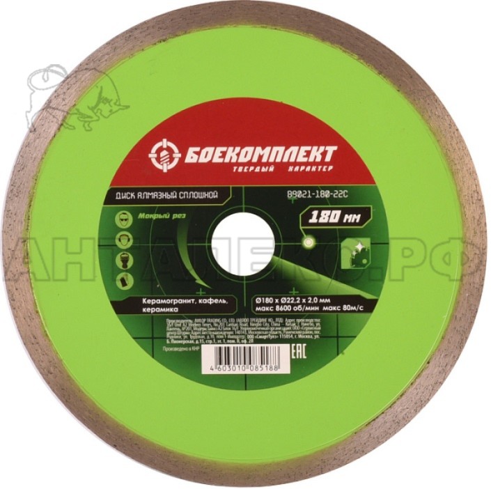 Алмазный диск БОЕКОМПЛЕКТ, 180x22,23 СПЛОШНОЙ, мокрый рез,