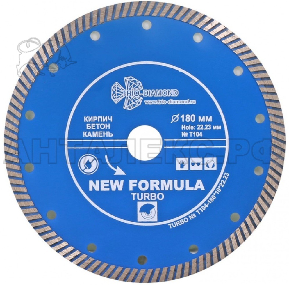 В интернет-магазине Анталекс.рф вы можете купить диск алмазный отрезной Trio Daimond TURBO 180мм, толщина 2.5 мм, посадочный 22.23 мм, сплошной оптом и в розницу с доставкой по всей территории РФ. Назначение диска - резание бетона, гранита, бордюрного камня и кирпича. Изготовлен из высококачественной стали с добавлением алмазной крошки. Рифленая кромка обеспечивает более чистый и аккуратный рез, чем с помощью сегментных дисков. Диск хорошо охлаждается, благодаря отверстиям. Диск отличается высокой скоростью. Диск может быть использован как для сухой, так и для влажной резки.