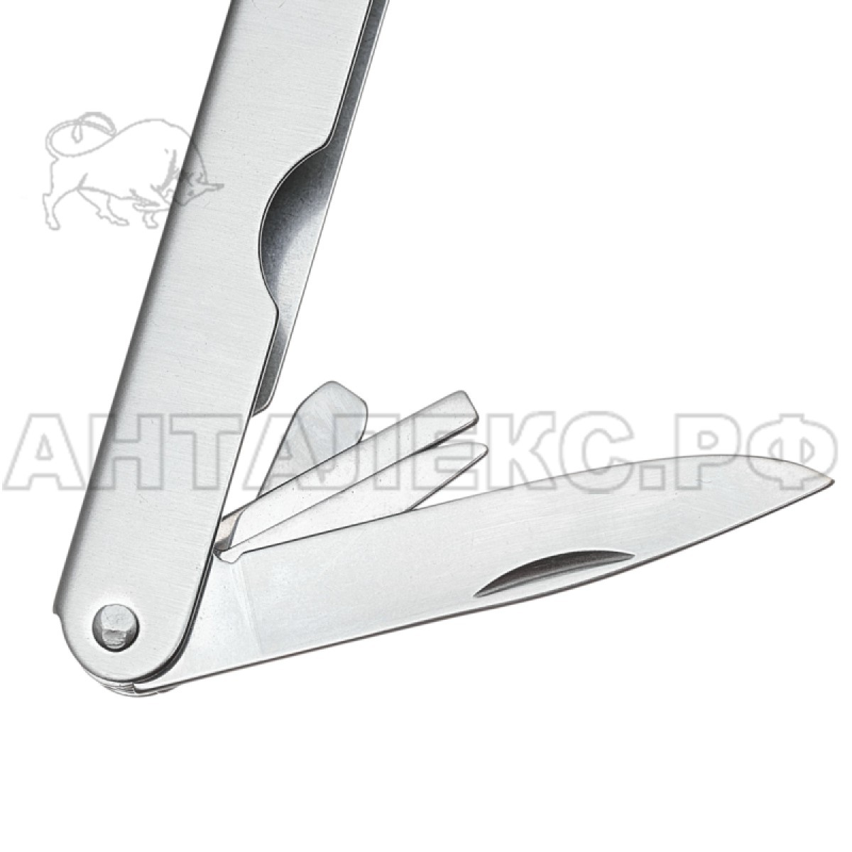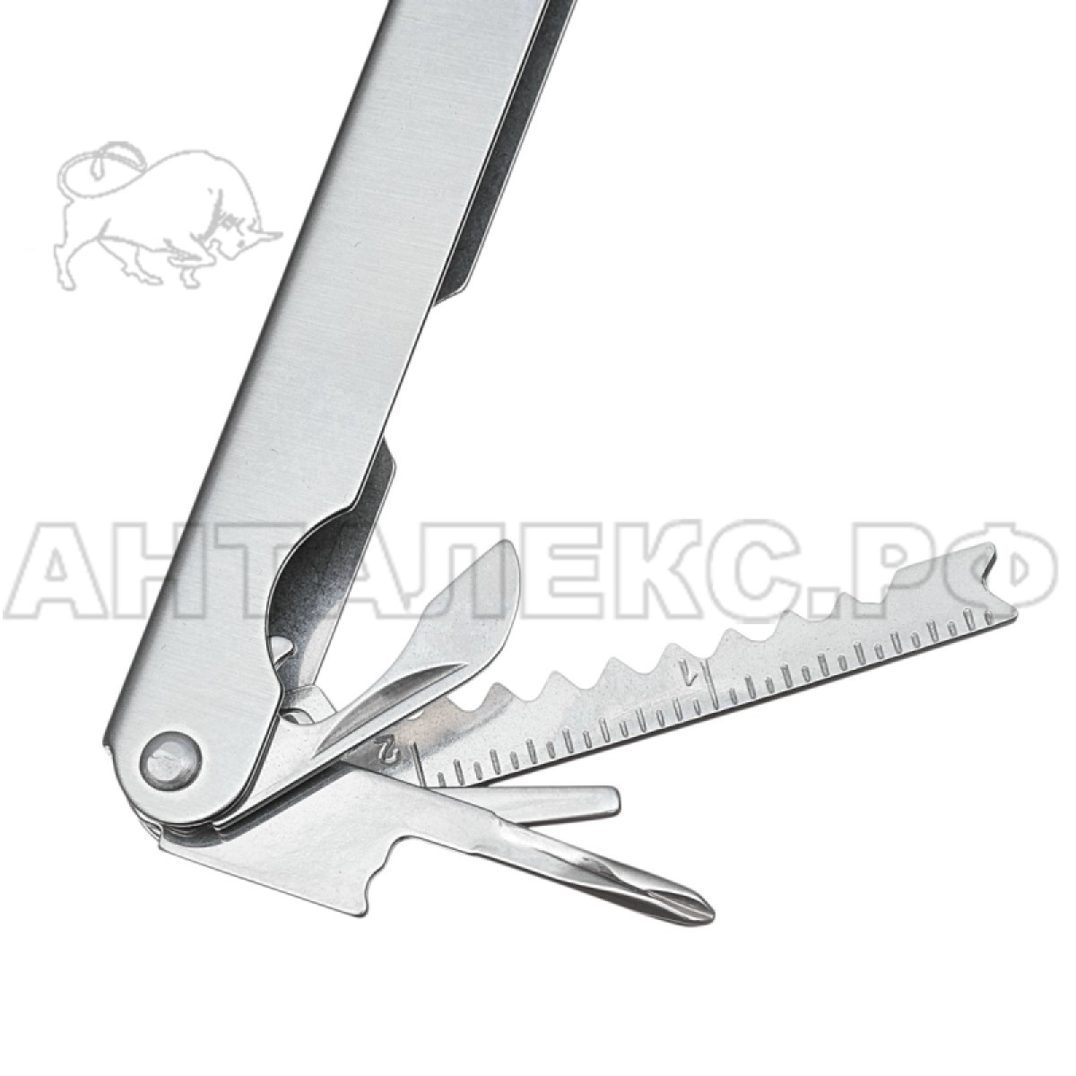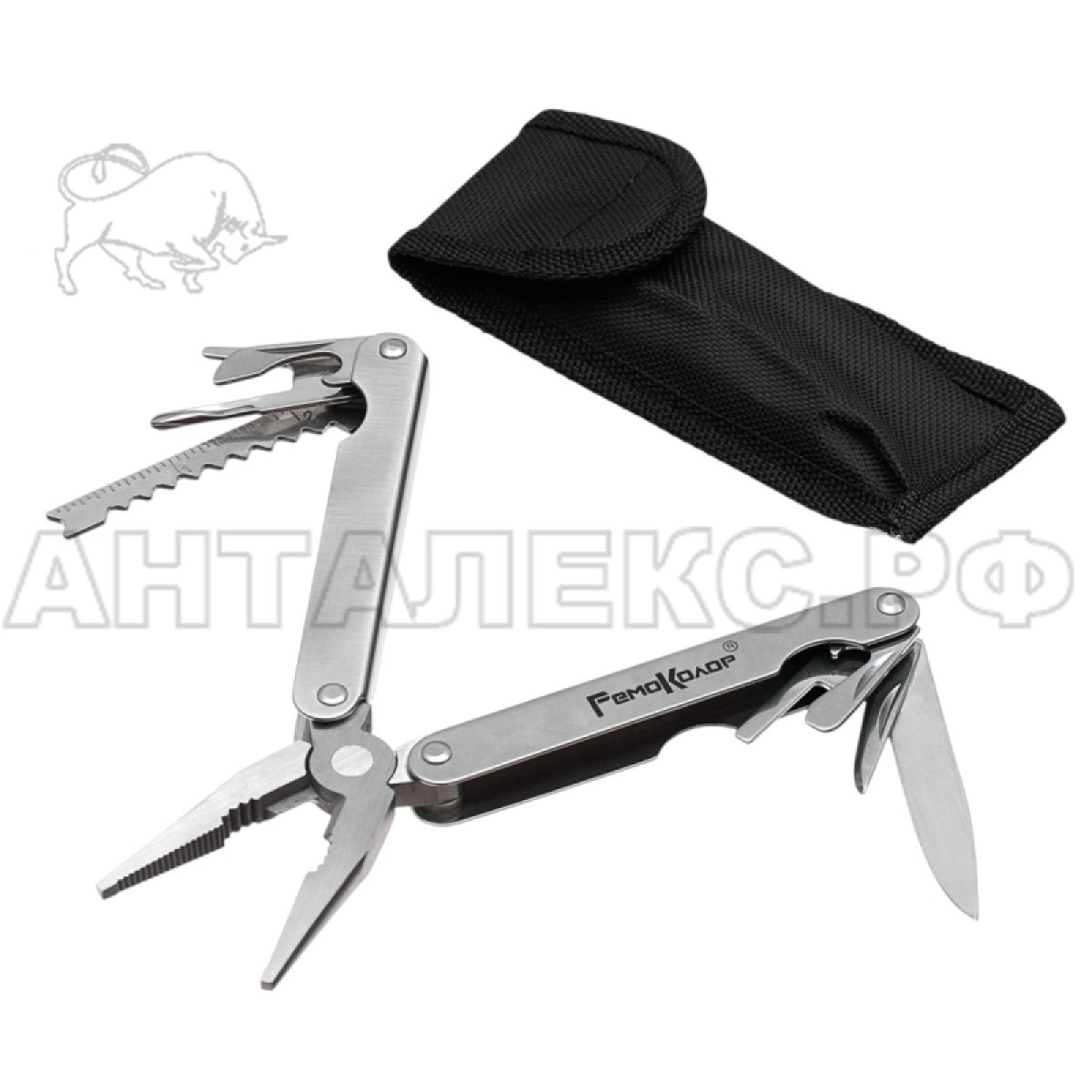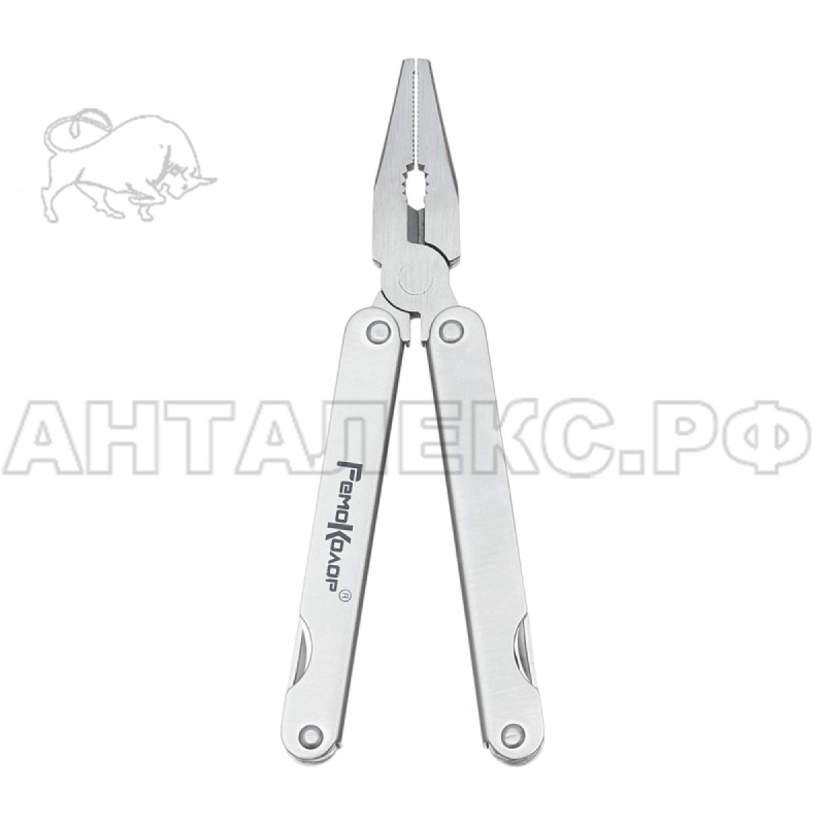 В комплект входят: плоскогубцы, кусачки, захват круглых предметов, крестовая отвертка, консервный нож, открывалка для бутылок, отвертки шлицевые – средняя и малая, пилка, шило, напильник, большой нож и т.д.