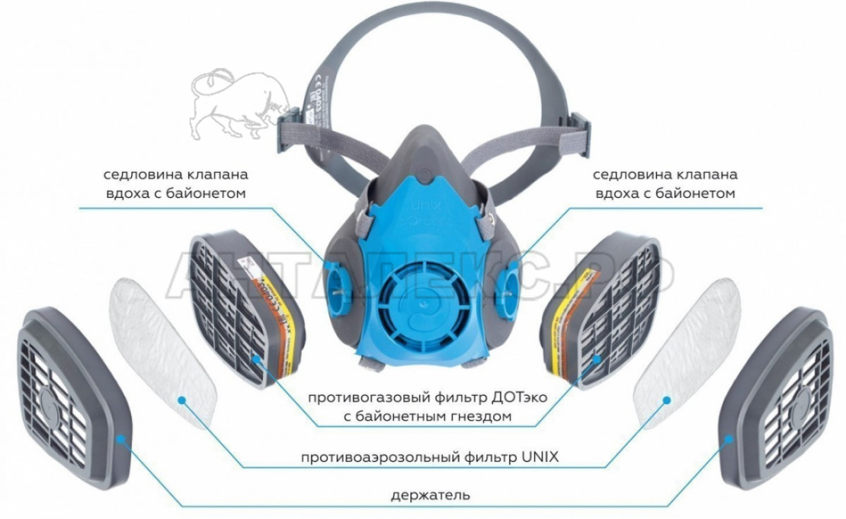 Респиратор состоит из изолирующей полумаски УНИКС, корпус которой выполнен из термопластичного эластомера, имеющей боковые седловины для байонетного присоединения фильтров, двух противогазовых фильтров ДОТ-эко трапециевидной формы в пластмассовом исполнении или двух противогазовых фильтров ДОТ-эко со съемными противоаэрозольными фильтрами УНИКС, или двух противоаэрозольных фильтров ДОТ-эко P3 D.