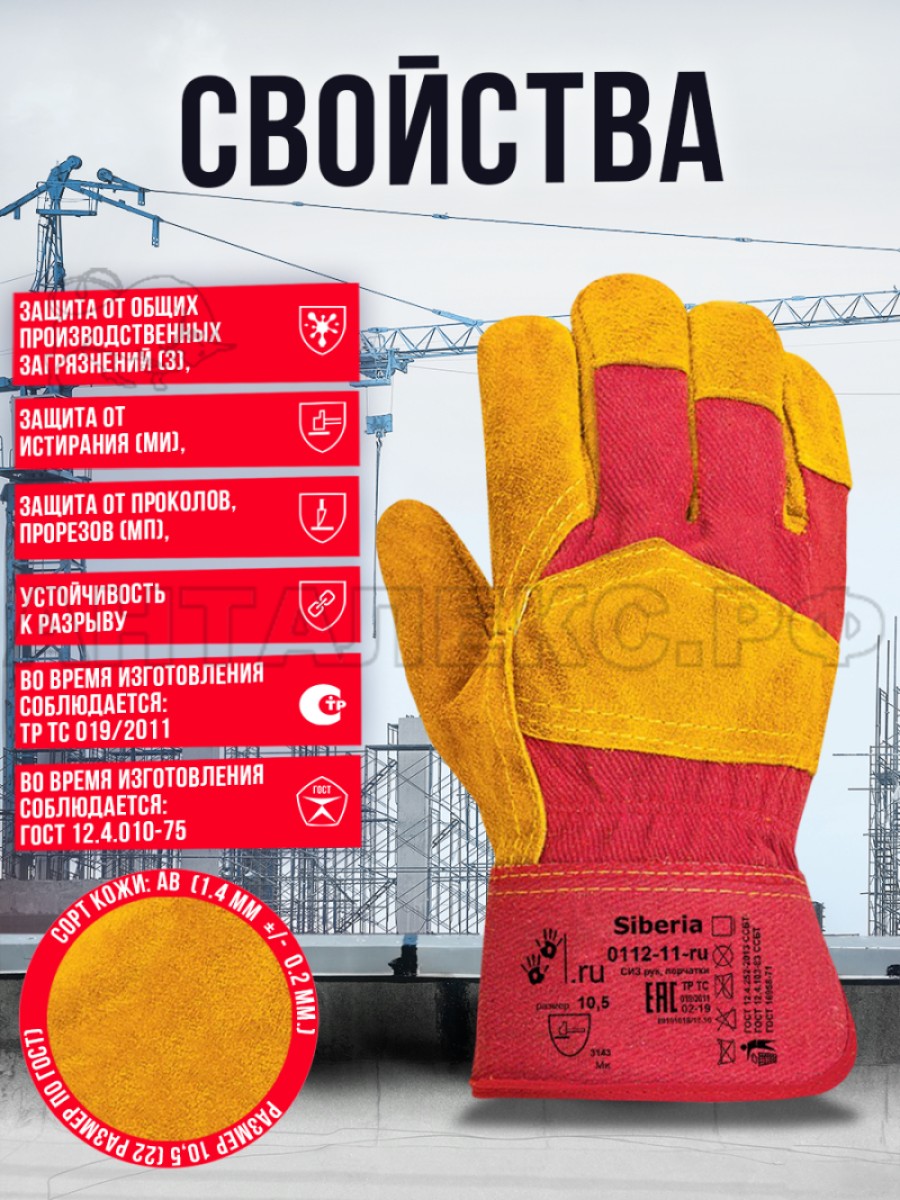 • Перчатки изготовлены из спилка кожи сорта "АВ" толщиной 1,4 мм +/– 0,2 мм, только из спинной части шкур, прошедших специальную обработку.