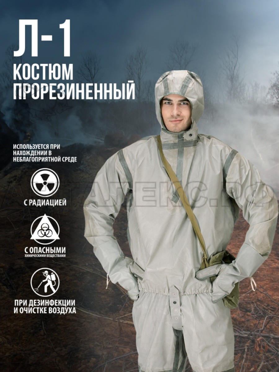 "Л-1" - легкий прорезиненный костюм изготовлен из высококачественного специального материла, с высокими защитными характеристиками. Костюм предназначен для защиты человека от воды, химического воздействия, вредных биологических факторов и радиоактивный пыли.